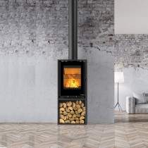 come camino fino alla stufa di design su panca porta legna.